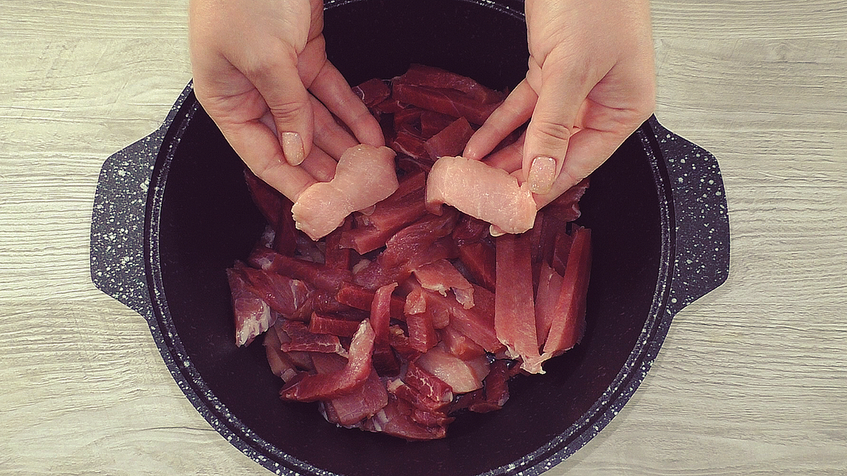 Мясо тушёное с луком на сковороде, достаточно простое, вкусное и сытное блюдо. Мясо получается сочным и нежным. Лук в процессе приготовления почти полностью разваривается, что придаёт подливе особенный вкус. Лука в рецепте должно быть много Я уверена Вы готовите прекрасные блюда из мяса. Так, что Америку я Вам не открою. Но не нужно забывать, что есть и начинающие хозяюшки...А так же будет здорово, если я напомню об этом рецепте тому, кто о нем совсем забыл. Понадобится: Мясо нарезать полосками или кусочками, как больше нравится. Желательно немного промокнуть бумажным полотенцем, чтобы удалить лишнюю влагу. Удобнее мясо выложить в глубокую посуду, посолить и поперчить по вкусу, если любите добавьте приправу для мяса. Далее сразу же добавляем две ложки муки и хорошо встряхиваем мясо. Надо чтобы каждый кусочек оказался в муке. Теперь выкладываем мясо на сковороду, с небольшим количеством растительного масла (в один слой) и обжариваем на сильном огне до образования красивой корочки (я жа