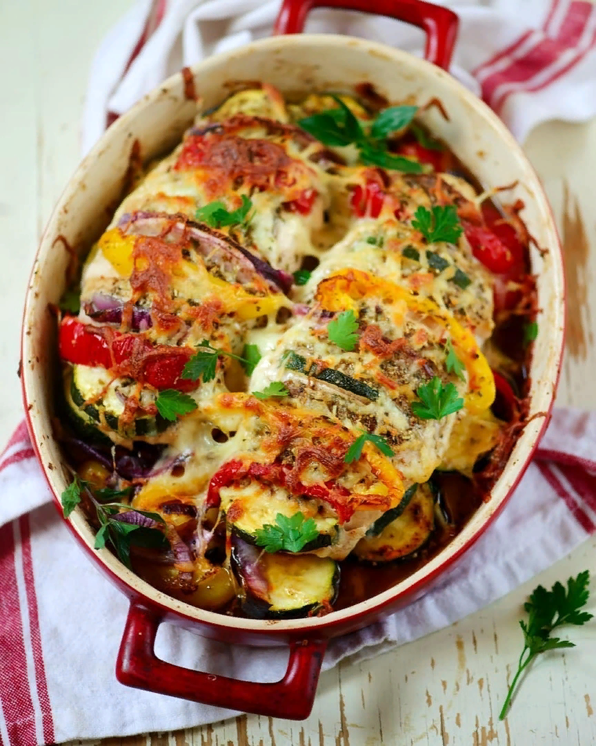 2. Овощи вымыть, перец и лук очистить. Нарезать перец полосками, лук тонкими полукольцами, помидоры и цукини — полукругом. Чередуя, вставить овощи в надрезы на грудках. Остальные овощи положить слоями в форму для запекания. Поперчить и посолить овощи, присыпать итальянскими травами. Положить грудки на овощи и посыпать итальянскими травами.