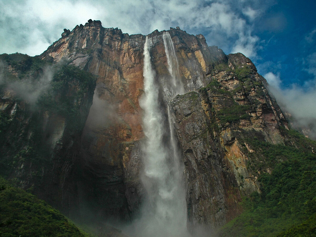 Этот невероятной красоты водопад находится в тропических лесах Венесуэлы на территории национального парка Канайма. Вода свергается с вершины Ауянтепуи, крупнейшей из венесуэльских тепуи — его название в переводе на русский означает «гора дьявола». Этот водопад не только красив, но и является самым высоким в мире: вода поднимается на 3212 футов с вершины Дьявольской горы в бездну внизу.