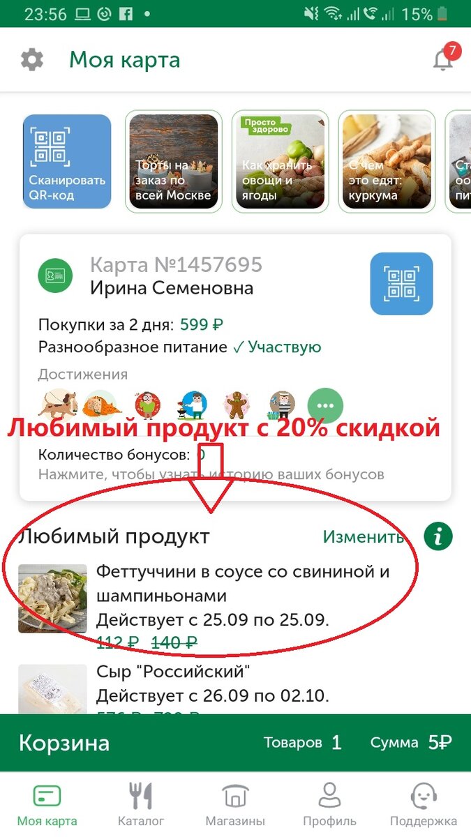 Любимый продукт можно менять хоть ежедневно - но действовать новый продукт в качестве "любимого" начнёт на следующий день. Допустим, я сегодня выбрала "Любимым продуктом" огурцы - и назавтра купила их с 20% скидкой. Поскольку огурцов мне теперь хватит сравнительно надолго, в качестве любимого продукта они мне больше не нужны - и я ставлю на "Любимый продукт", к примеру, сыр. Тогда на следующий день я могу купить с 20% скидкой этот самый сыр.