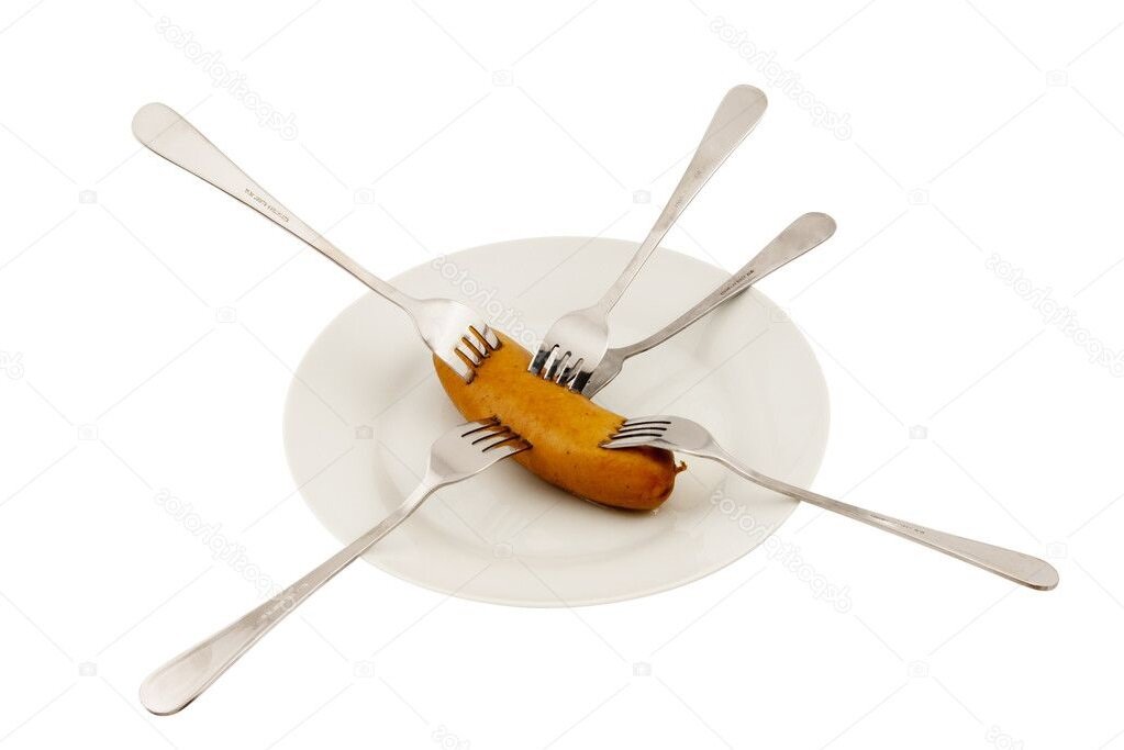 Разгадка: Десять голодных студентов добыли себе одну сосиску на всех. Решили делить по-честному-отдать ее самому голодному. Для этого положили сосиску на тарелку и поставили на середину стола. Каждый взял в руку по вилке. На "раз-два-три" выключили свет и накинулись на сосиску кто быстрее. Один решил всех обмануть и схватил сосиску рукой...