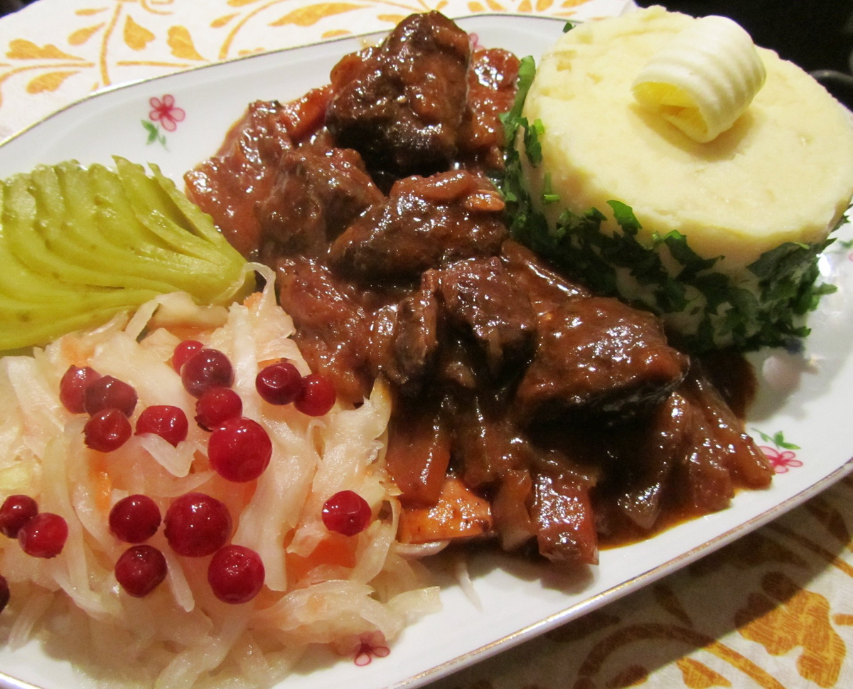 Я думаю, что некоторые вольности в рецептуре допустимы и каждая хозяйка решит как обойти сложности с можжевеловыми ягодами или бульоном из лося)))