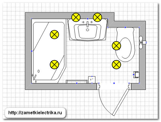 Теперь на нашем плане отобразим расположение всех светильников санузла.
