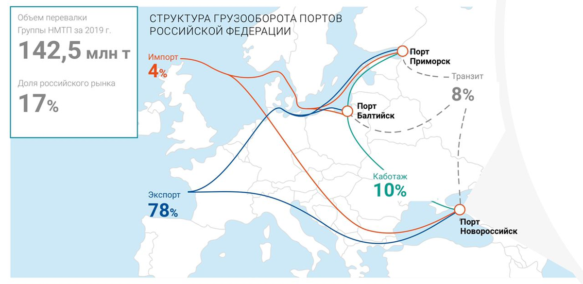 Группа "Новороссийский морской торговый порт" – крупный портовый оператор с долей на российском стивидорном рынке порядка 17%. В состав Группы входят порт Новороссийск (Черное море), порт Приморск (Балтийское море) и порт Балтийск (Балтийское море). Порты Группы встроены в международные транспортные коридоры, связывающие Россию со странами Средиземноморья, Ближнего Востока, Северной Африки, Юго-Восточной Азии, Северной и Южной Америки, что делает их ключевым каналом транзита российских импортных и экспортных грузов.