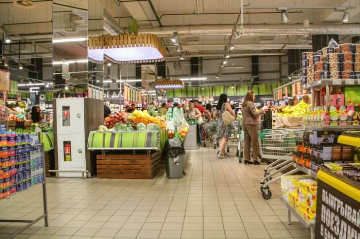 В современных супермаркетах приятная атмосфера и большой ассортимент продуктов питания.