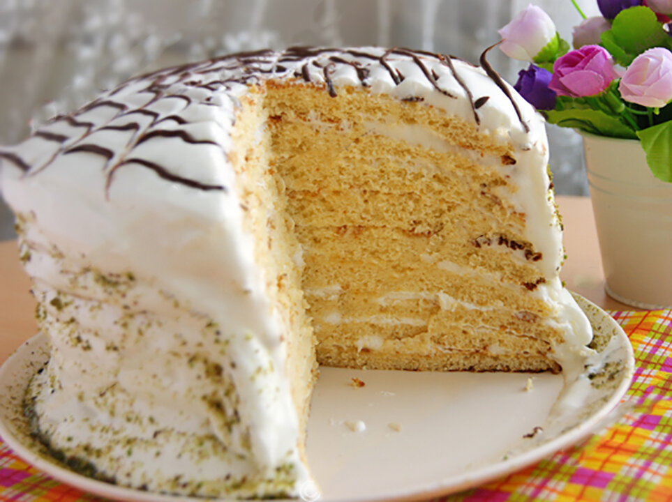 У меня он получился огромный! Украсьте как хотите и поставьте на ночь в холодильник пропитываться. Я его почти не украшал. Чуть-чуть бока обсыпал орехами, а сверху сделал паутинку.