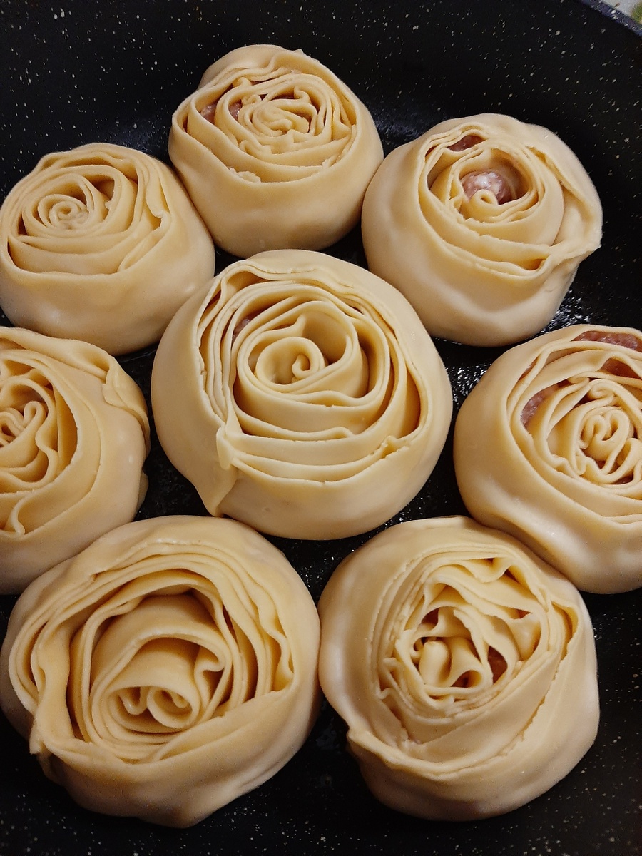 Раскатываем полоску теста шириной 6-7см, и длиной 30 см (размер можно варьировать). В середину укладываем полоску фарша по всей длине. Складываем по горизонтали пополам и защипываем, примерно, каждые 5 см по длине. После сворачиваем в форме цветочка.