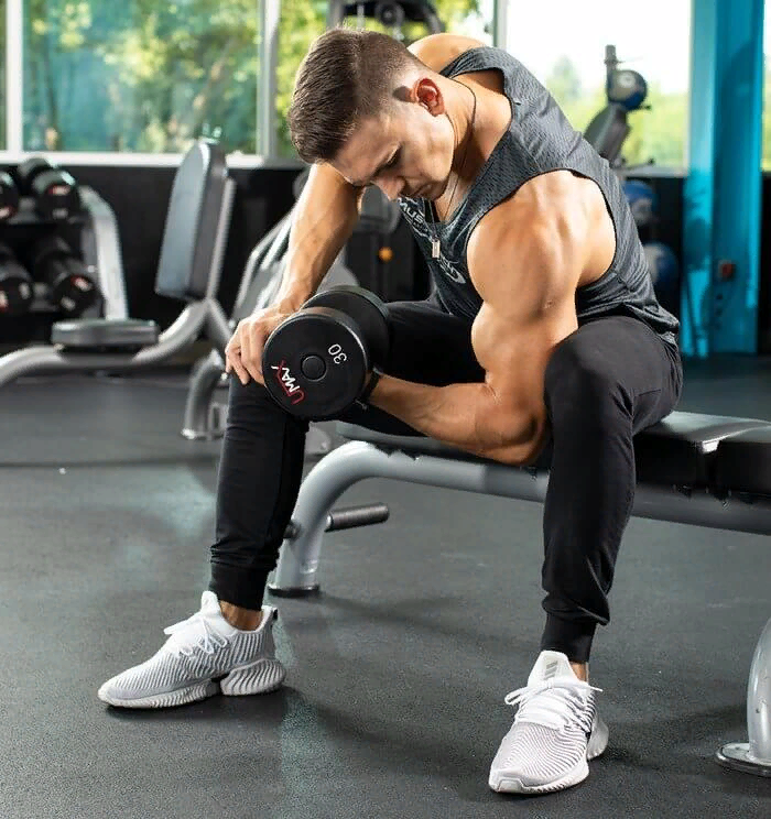 Если Вы только начинаете качать трицепс, то следует использовать гантели с небольшим весом, а затем постепенно увеличивать нагрузку. Ложимся на скамью или табуреты так, чтобы ноги твердо стояли на земле