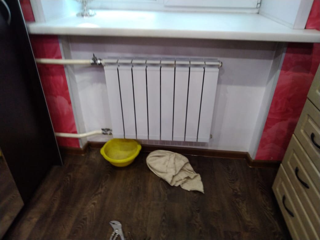 В квартире жила молодая пара. Не знаю, по незнанию ли, в целях экономии, по чьему-то совету или по иной причине, а может и до них были установлены вот такие радиаторы. Миска, заботливо подложенная под нее хоть и умиляла заботой родителей о своем новом жилище, но требовала вмешательства.