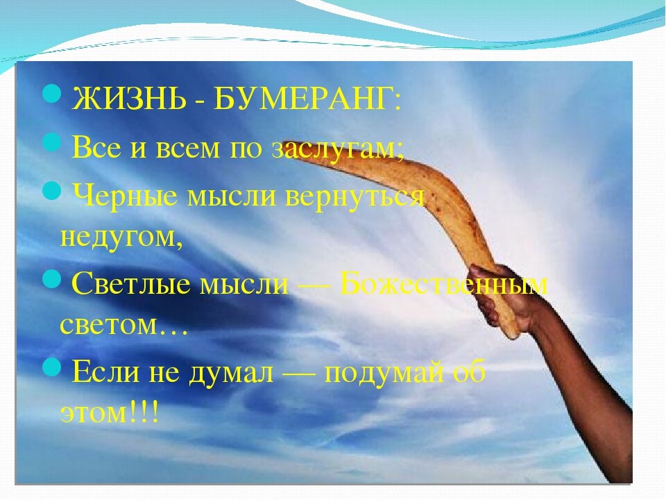 ЖИЗНЬ - БУМЕРАНГ. К тому ведется: Что отдаете, то и вернется. То, что посеешь - то и пожнешь, Ложью пробьется Ваша же ложь. Каждый поступок имеет значенье; Только прощая, получишь прощенье. Вы отдаете - Вам отдают, Вы предаете - Вас предают, Вы обижаете - Вас обижают, Вы уважаете - Вас уважают… ЖИЗНЬ - БУМЕРАНГ: Все и всем по заслугам; Черные мысли вернуться недугом, Светлые мысли -