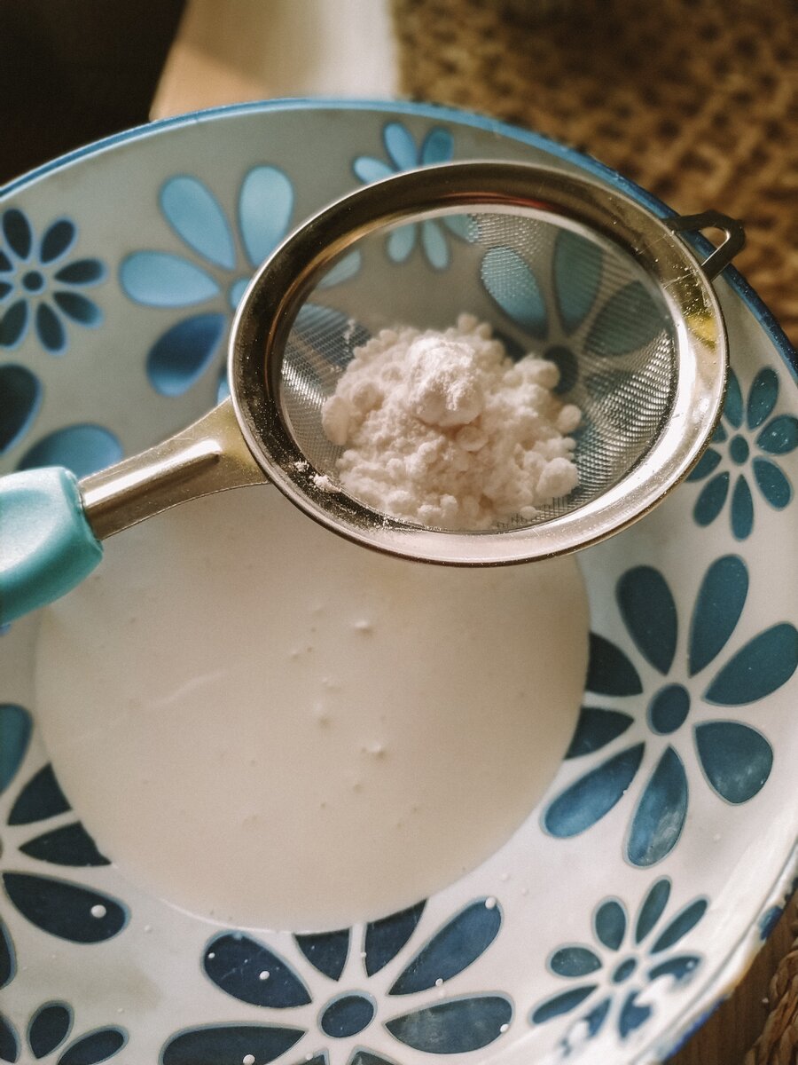 - В глубокую миску выливаем сливки и через сито просеиваем сахарную пудру. Взбиваем сливки миксером на минимальной скорости до растворения пудры. Далее, увеличиваем скорость и смешиваем сливки до состояния густых пиков.