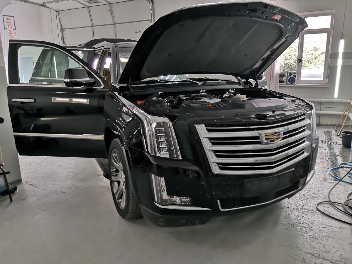 Роскошный новенький внедорожник Cadillac Escalade прибыл к нам на шумоизоляцию с жалобами на «пустые» и звонкие для машины такой стоимости и класса двери, не идеальное звучание штатной акустики и достаточно высокий общий уровень шума в салоне при движении по шероховатому асфальту на высокой скорости. Так как автомобиль используется для частых дальних поездок, владелец машины выбрал максимальный вариант шумоизоляции «Премиум»