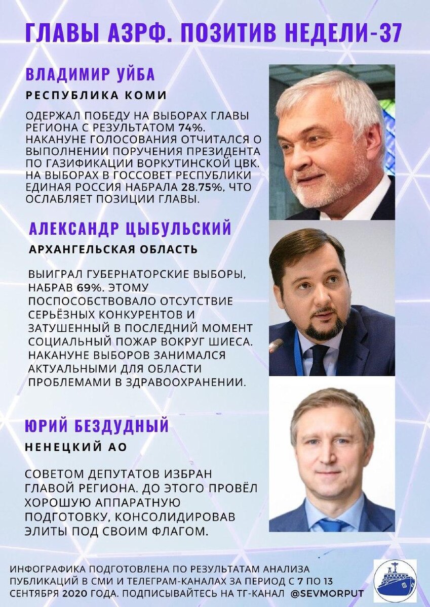 Одержал победу на выборах губернатора Республики Коми с результатом 74%. Последний месяц накануне голосования транслировал близкую себе медицинскую повестку и успехи в привлечении инвестиций, в частности, Газпрома по газификации. На прошедшей неделе закрепил позитив новостью о выполнении поручения Президента по газификации воркутинской ЦВК. Немного ослабляет позиции уже избранного главы Коми довольно слабая кампания «Единой России» на выборах в региональный Госсовет (28.75%).