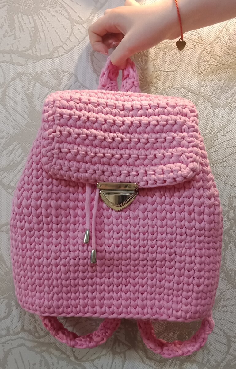 Рюкзачок для дочки. связан из трикотажной пряжи. Получился очень плотный за счет чего идеально держит форму, достаточно вместительный. Дочка пробегала с ним все лето.