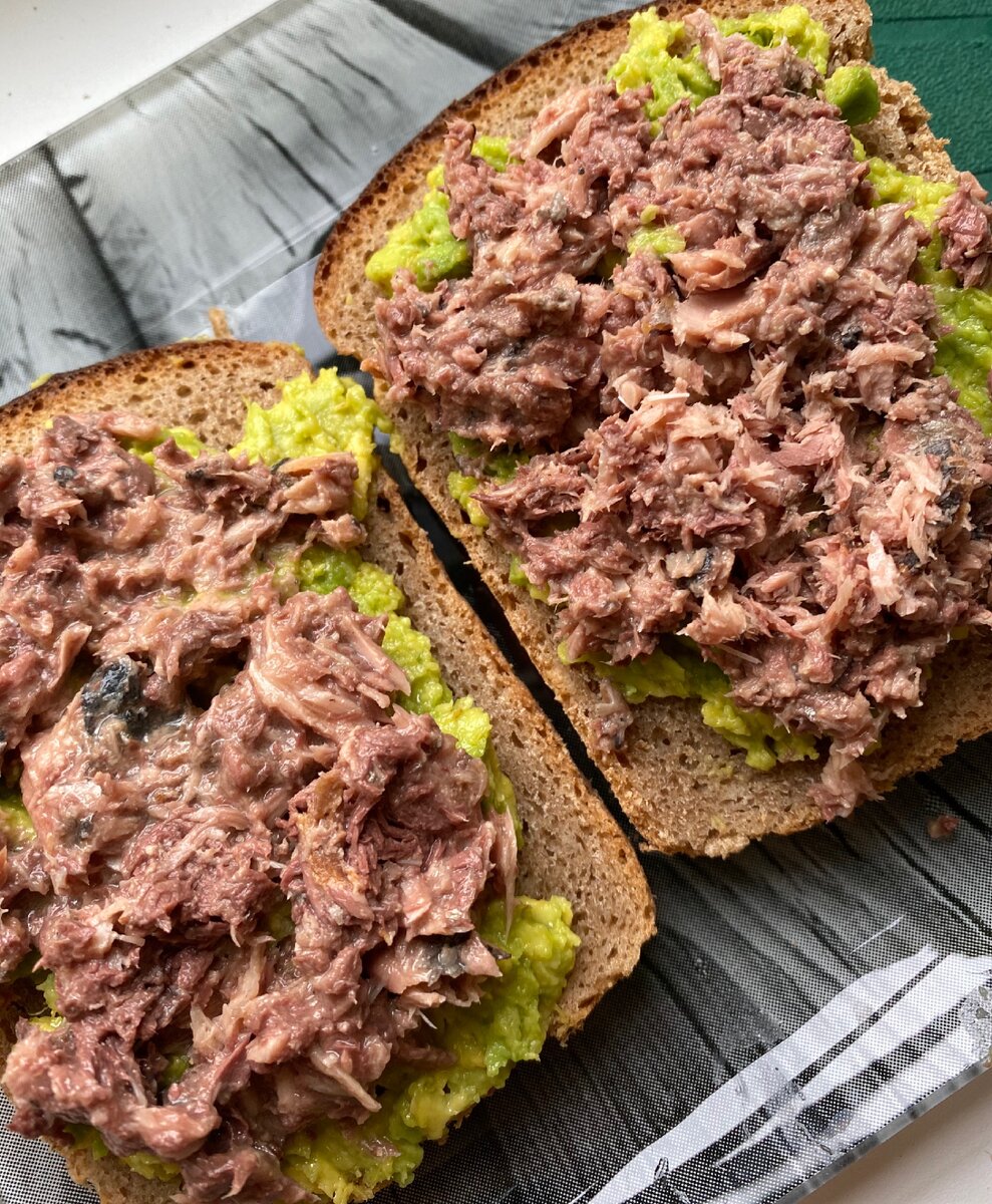 Спелый авокадо разминаем вилкой, выкладываем на кусочек хлеба и сверху кладём тунец. Божественный бутерброд готов за считаные минуты! Приятного аппетита.