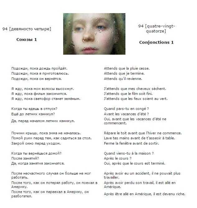 Французский язык. Урок 1. Французский язык. Урок 93. Добрый день! Продолжим изучение французского языка. Французский язык. Урок 94. 94 (девяносто четыре) - 94 (quatre-vingt-quatorze) Союзы 1 - Conjonctions 1 Подожди, пока дождь пройдёт. - Attends que la pluie cesse. Подожди, пока я приготовлюсь. - Attends que je termine. Подожди, пока он вернётся. - Attends qu’il revienne. Я жду, пока мои волосы высохнут. - J’attends que mes cheveux sèchent. Я жду, пока фильм закончится. - J’attends que le film soit fini. Я жду, пока светофор станет зелёным. - J’attends que les feux soient au vert. Когда ты едешь в отпуск? - Quand pars-tu en congé? Ещё до летних каникул? - Avant les vacances d’été? Да, перед началом летних каникул. - Oui, avant que les vacances d’été ne commencent. Почини крышу, пока зима не началась. - Répare le toit avant que l’hiver ne commence. Помой руки перед тем, как садиться за стол. - Lave tes mains avant de t’asseoir à table. Закрой окно перед уходом. - Ferme la fenêtre avant