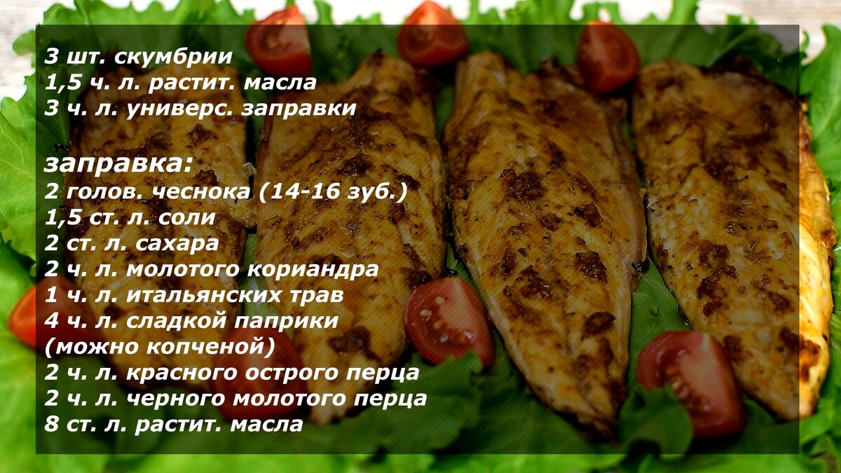 Скумбрия получилась сочная, ароматная,пряная и очень вкусная. Так как в моей заправке была добавлена копченая паприка, скумбрия имеет ароматные нотки дымка и копчения. Подавать такую рыбу можно с любым граниром, с картошечкой, с рисом, а также с овощами. Она прекрасно будет смотреться на праздничном столе.