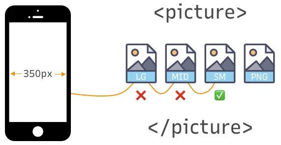 HTML предлагает элемент <picture>, который позволяет нам указать точный ресурс изображения, который будет отображаться на основе добавляемого нами медиа-запроса. Как описано ранее, вместо того, чтобы отправлять одно изображение (обычно это большая версия картинки с высоким разрешением) на все размеры экрана и масштабировать его до ширины области просмотра, мы указываем набор изображений, которые будут использоваться в определенных ситуациях.