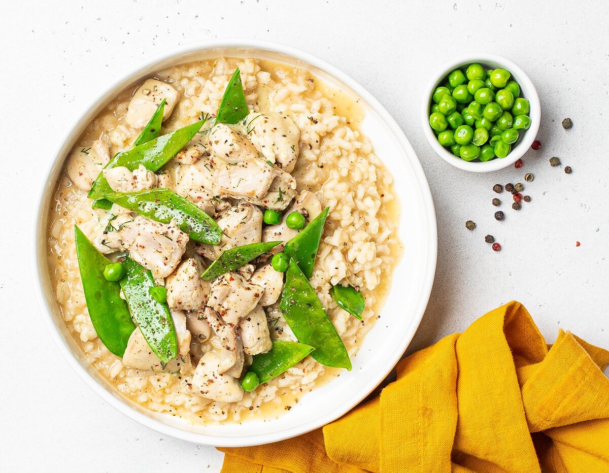 Соус бешамель и зернистую горчицу добавляем в сковороду. Помешиваем 1 минуту. Основу для ризотто разминаем руками в пакете и добавляем в сковороду. Половину упаковки овощного бульона и чуть-чуть соли добавляем в сковороду. Помешиваем 2 минуты. Уменьшаем огонь до слабого.⠀