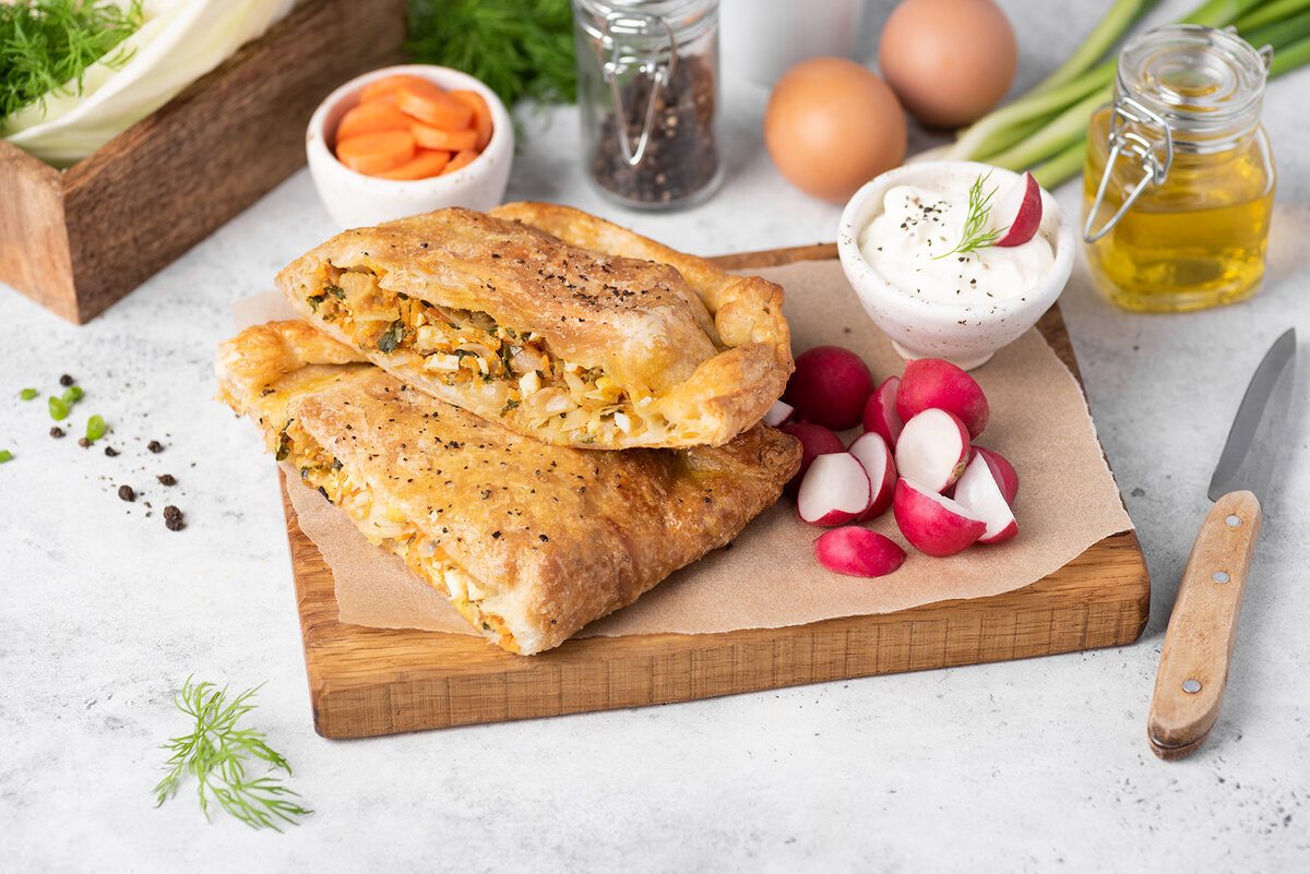 Включаем духовку на 180 °С. Пергамент расстилаем на ровную поверхность. Смазываем 1 ч. л. раст. масла. Пласт бездрожжевого слоёного теста аккуратно кладём на пергамент. Раскатываем тесто с помощью скалки (или растягиваем руками). Режем тесто пополам. Пергамент с одной половиной теста перекладываем на противень.⠀