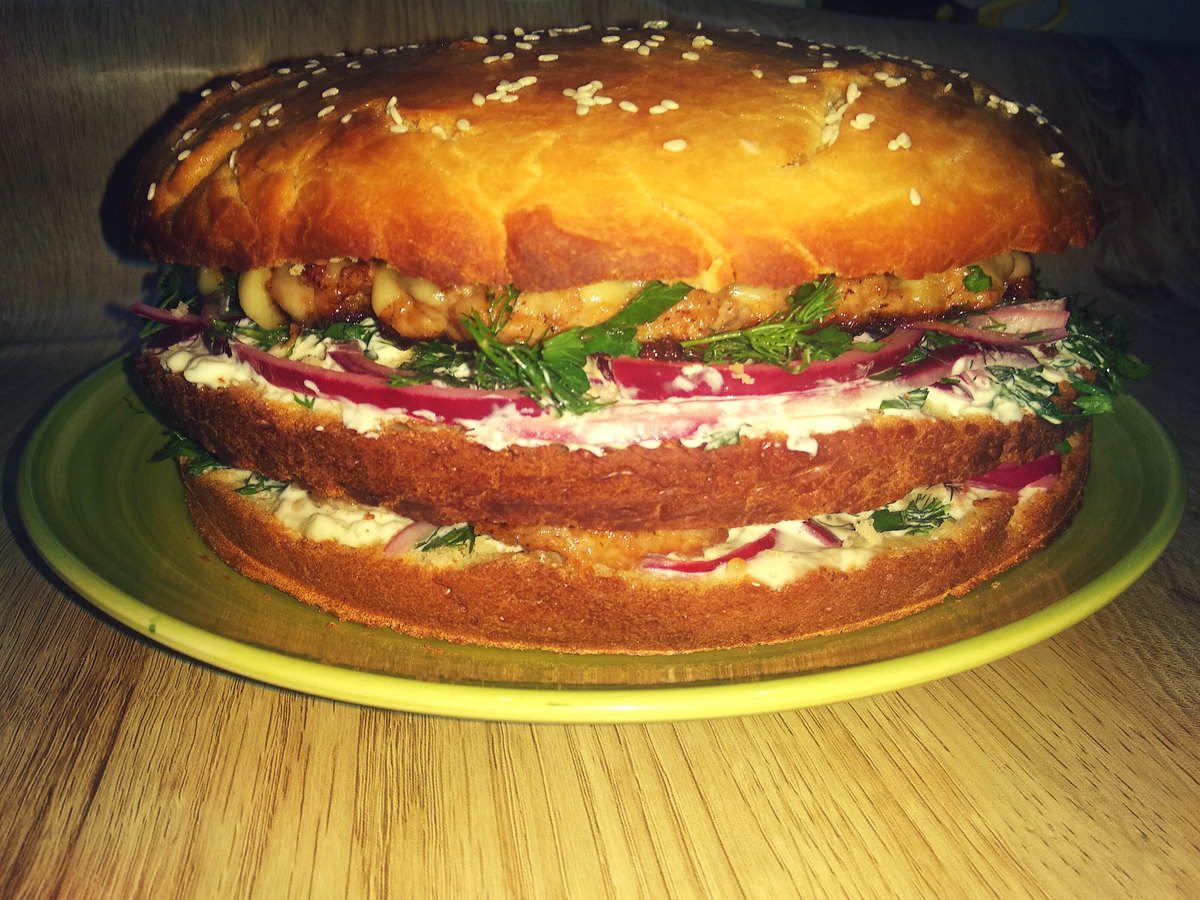 Вы любите бургеры? А ваши друзья? Если да, то этот рецепт для вас!)) Один гигантский бургер на всех! Приготовьте его к приходу ваших друзей и удивите их размерами и вкусом домашнего сытного бургера!))