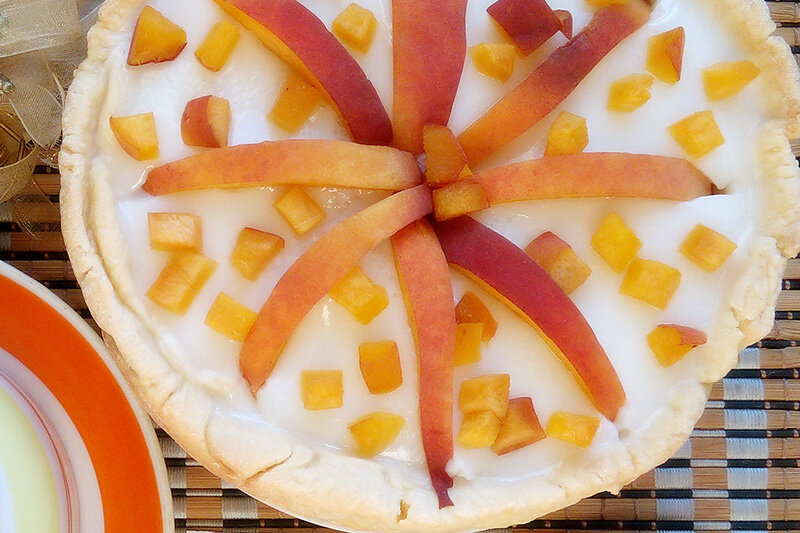 В это время возвращаемся к остывшей жидкости с желатином, куда мы и вводим йогурт без наполнителя. Аккуратно переливаем жидкую начинку в готовое тесто и оставляем десерт в холодильнике на 30 минут, чтобы йогурт слегка застыл. На последнем этапе промываем сочный персик, разрезаем его, удаляем ненужную косточку и нарезаем одну половину плода дольками, а вторую – мелкими кубиками, чем и украшаем десерт. Возвращаем йогуртовый тарт с персиками в холодильник на пару часов.