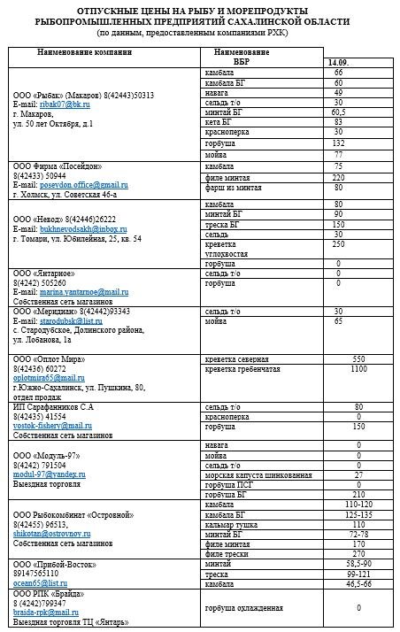Мониторинг минимальных отпускных цен на рыбу и морепродукты за период 7-14 сентября 2020 года