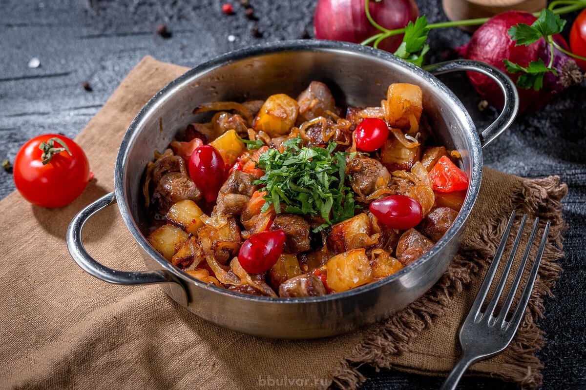 Тушенные в котелке блюда всегда сочные и очень вкусные. Особенно аппетитным получается мясо с овощами. Потребуется 6 бараньих голяшек или 1 кг шеи, 2 баклажана и 2 крупных болгарских перца, молодой чеснок (1 цельная головка и еще 2 дольки), 3 луковицы, 4 помидора, соль, зелень кинзы и перец.
