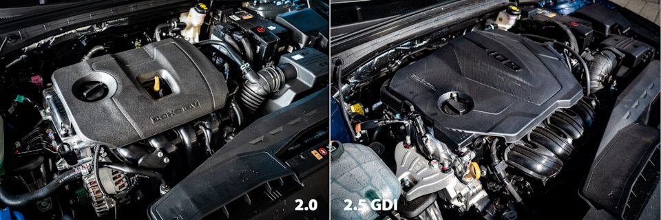 Основные отличия — в дизайне внешности и интерьера, а также в том, что в Kia доступна более продвинутая версия силового агрегата. Оба мотора 2.5 литра, новой серии SmartStream, но в Sonata используется версия G4KM c распределенным впрыском (180 л.с./232 Нм) и старой шестиступенчатой АКП A6MF2, а у Kia — версия G4KN-5 с комбинированным впрыском (194 л.с./246 Нм). На цилиндр тут по две форсунки, одна — в цилиндре, вторая в коллекторе. То есть мотор может работать как на непосредственном, так и распределенном впрыске, в зависимости от условий движения.