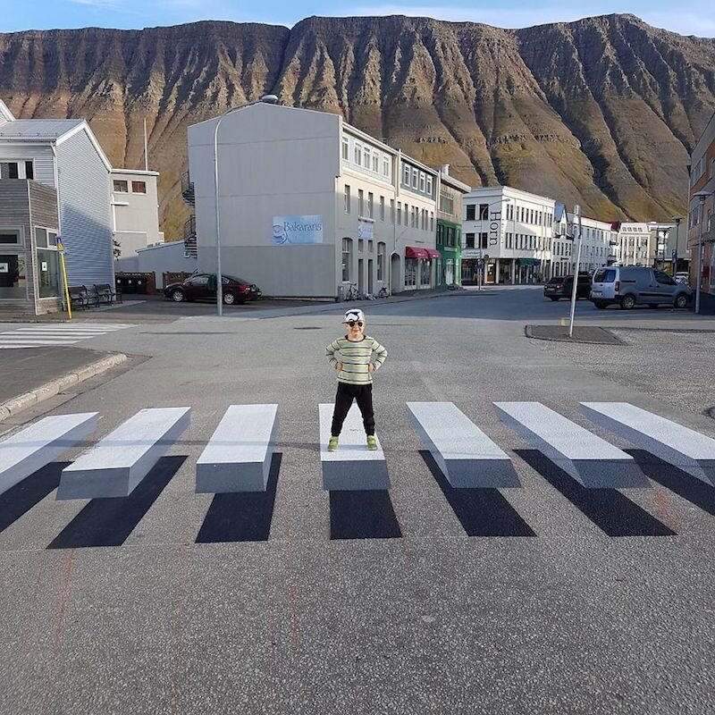 Игнорирование водителями зебры — дорожной разметки, обозначающей пешеходный переход — проблема, существующая во многих странах, в том числе и Исландии. Администрация небольшого рыбацкого городка Исафьордюр, расположенного на северо-западе страны, решила поэкспериментировать с видом пешеходной дорожкой разметки. Для этого были приглашены художники, нарисовавшие зебру на асфальте в 3D. После такого даже самый заядлый любитель скоростей вынужден будет притормозить перед зеброй, чего и добивалась администрация.