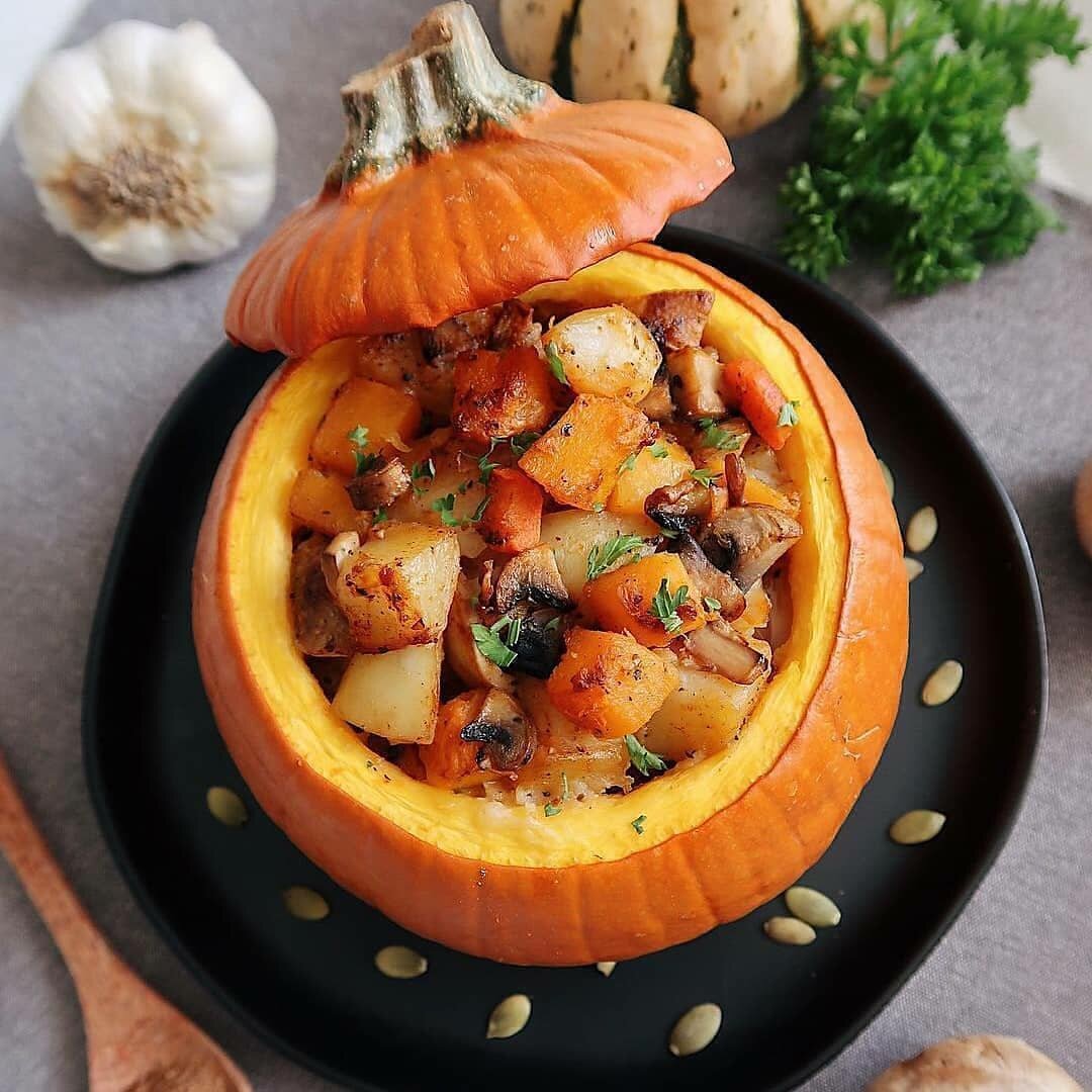 Жаркое в тыкве ⠀ Ингредиенты на одну порцию: ⠀ * Тыква - 1 шт. * Тыква, нарезанная кубиками - 200 г * Картофель - 2 шт. * Половина 1 моркови * Половинка 1 луковицы * 1 зубчик чеснока * Грибы - 4 шт. (Я использовала шампиньоны) * Зелень - по желанию. (Я использовала свежую петрушку) * Растительное молоко - 1 стакан (Я использовала овсяное молоко) * Соль и специи - по вкусу. (Я использовала такие специи: копчёную паприку, мускатный орех, смесь сушёных овощей, чёрный молотый перец, соль, шалфей, кардамон) ⠀ Рецепт приготовления: ⠀ Картофель, морковь и мякоть тыквы нарезать крупными кусочками и обжарить на растительном масле до готовности. Позже добавить мелко нарезанные грибы. Всё обжарить, посолить и добавить специи. Чеснок мелко нарезать, лук нарезать полукольцами. Нарезанный лук и чеснок отправить на сковороду, и обжарить до готовности. Позже добавить специи, зелень и небольшое количество растительного молока. Потушить некоторое время. ⠀ Подготавливаем тыкву ⠀ Помыть и обсушить тыкву.