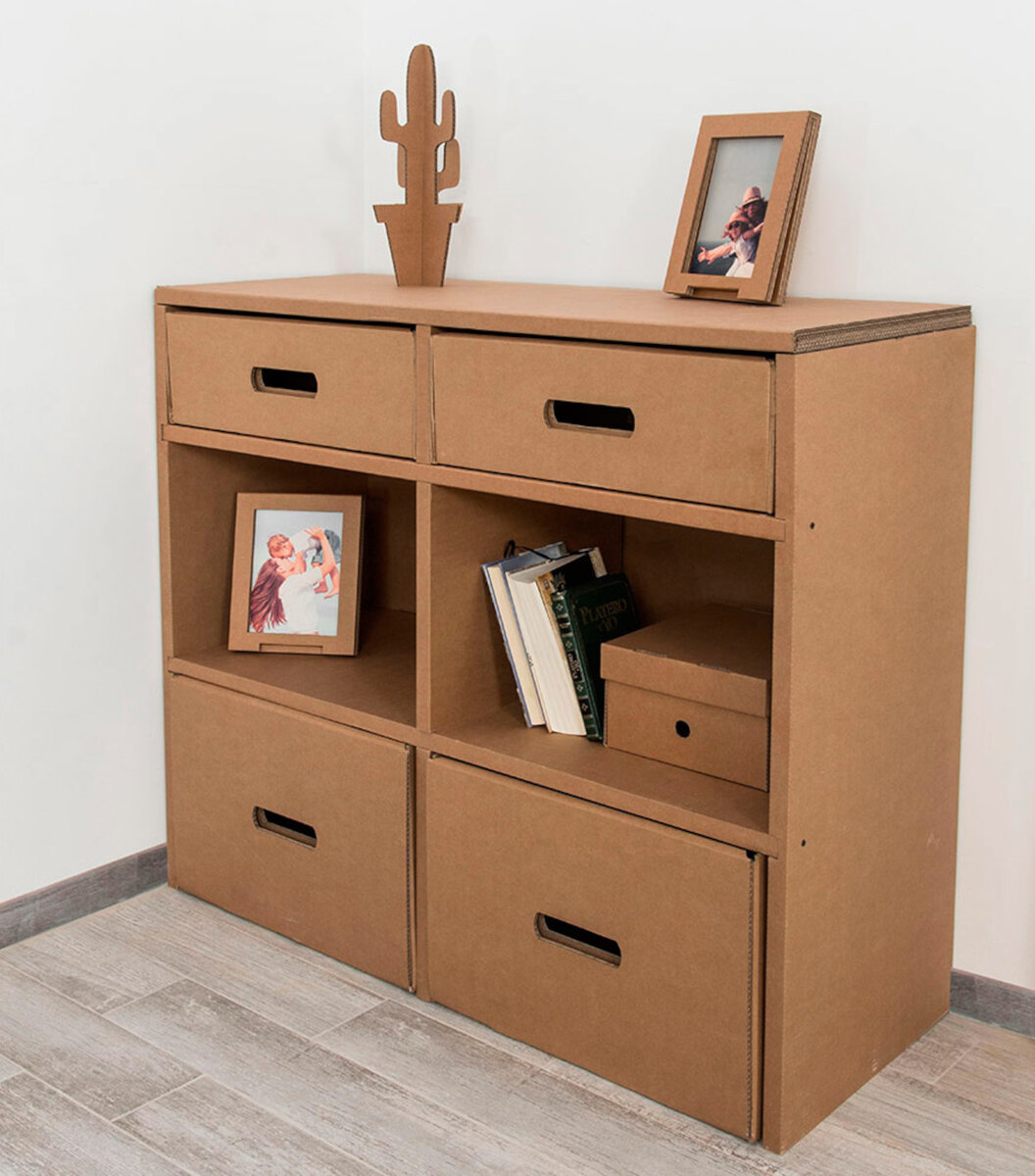 Стеллаж можно оснастить дополнительными выдвижными ящиками из гофрокартона, в них удобно складывать и хранить вещи и одежду. Полки без ящиков подойдут для размещения на них книг и прочих бытовых мелочей, каких в каждой квартире найдётся немало.