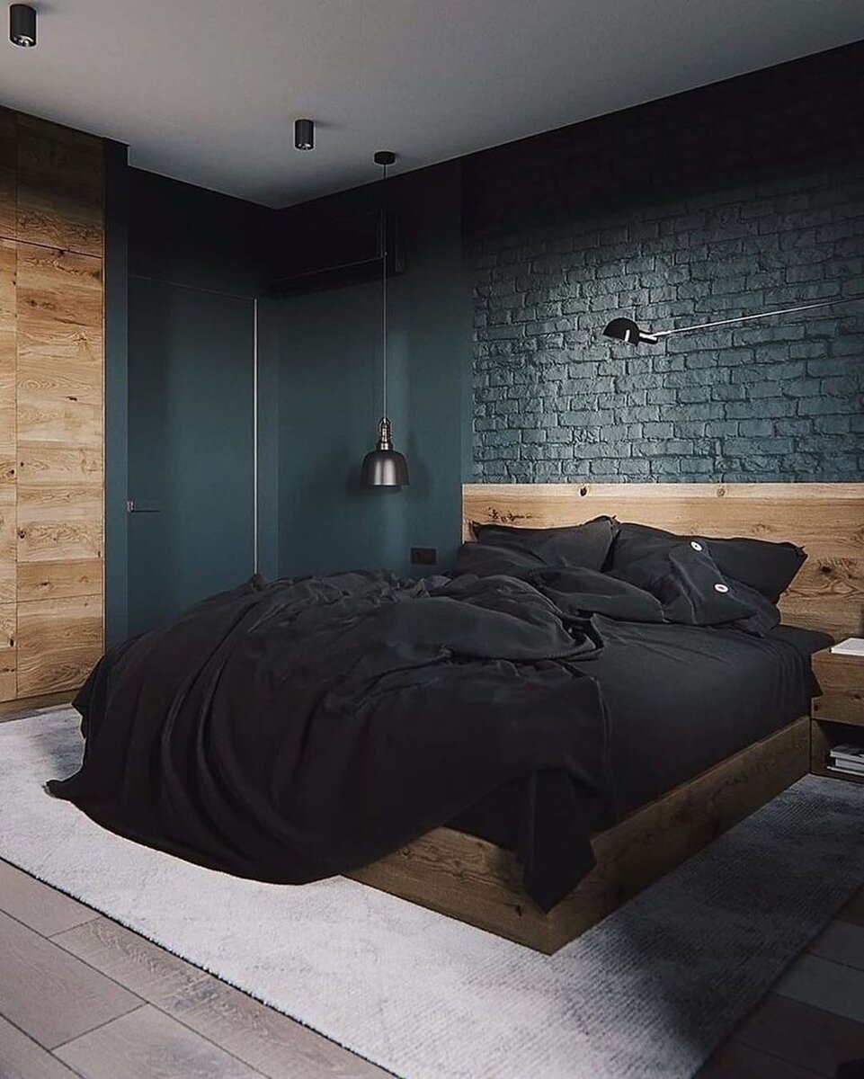 В этой спальне доминирует тёмно-зелёный, глубокий и благородный. А постельное бельё и аксессуары — чёрные, но разных тонов.