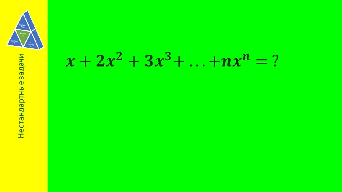 Математика онлайн. Доступно о сложном Здравствуйте, уважаемые любители математики! Предлагаю познакомиться с задачей, при решении которой используются сумма геометрической прогрессии, нахождение производных и анализ возможных значений параметра. Поехали... Выносим x за скобки. Замечаем, что все слагаемые в скобках - это производные степенной функции. Теперь надо упростить получившееся выражение. Это - сумма n первых членов геометрической прогрессии. Не забываем про знак производной... Применяем таблицу производных, раскрываем скобки. Осталось привести подобные слагаемые и ответ будет готов. Почти... Получившееся выражение не имеет смысла при x=1. Поэтому возвращаемся к началу и рассматриваем этот случай отдельно. Вот теперь уже все ))) Задание - из "Сборника конкурсных задач по математике" Говорова В.М. и др. Предлагалось на устном экзамене в МФТИ в 1981 году. Не забудьте подписаться на канал, если - Вам интересны вопросы, которые здесь разбираются; - Вам могут потребоваться