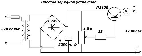 Для получения постоянных 12 Вольт используется выпрямитель на диодах Д245 и простейший стабилизатор на транзисторе П210Б ("А" – это обозначение амперметра).