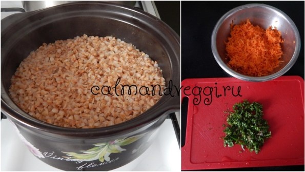 1. Гречку отварите в 2,5 стаканах воды 30-40 минут, пока не впитается вода.