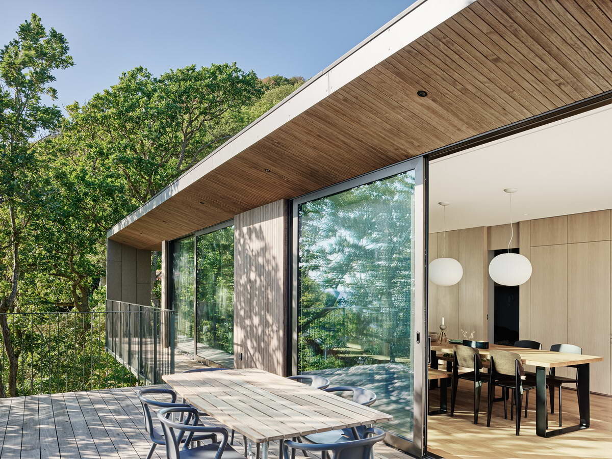 Двенадцать стальных колонн поднимают дом над землей и ставят его на один уровень с окружающими верхушками деревьев. Возвышенное положение усиливает его удивительные виды и отдаляет его от соседней улицы.