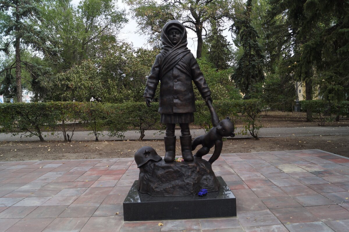 Это сталинградская девочка с плюшевым медведем. Высота бронзовой фигуры — 1,55 метра, ее изготовили в мастерской Жуковского. В Волгоградской области до сих пор проживают почти 5500 детей военного Сталинграда.