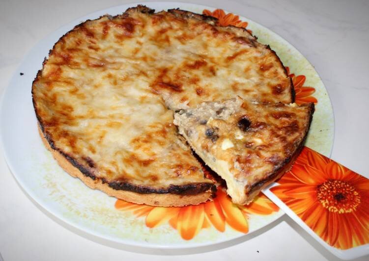 Форму для запекания смазываем сливочным маслом. Выкладываем тесто, расправляя руками, добавляем начинку и поливаем заливкой.