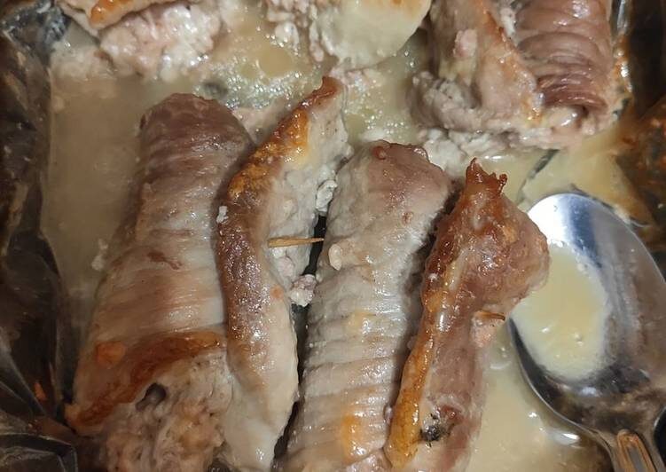 Нарезать свинину на стейки, отбить с двух сторон, посолить поперчить, на каждый кусочек мяса положить полосочку ветчины и сыра, завернуть в трубочку, противень смазать маслом, выложить на противень рулетики, запекать 40 мин в духовке при 180° приятного аппетита!