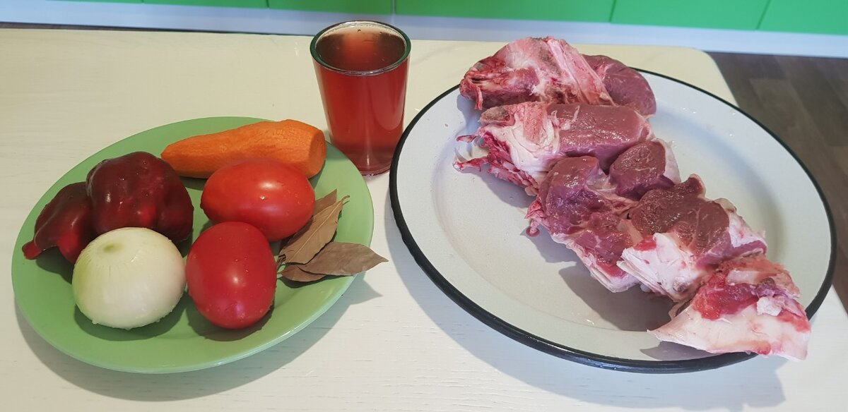 Ингредиенты: 1.5 кг говяжьего хвоста, болгарский перец, луковица, морковь, два помидора, лавровый лист, два зубца чеснока, черный молотый перец, соль, стакан сухого вина.