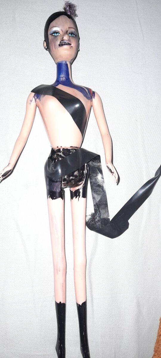 Это кукла моей восьмилетней дочери. Дорвавшейся до маркеров. И только сейчас понял, что не только до маркеров, но и до изоленты. Надеюсь, что она извела её не всю. Хотя надежда слаба....