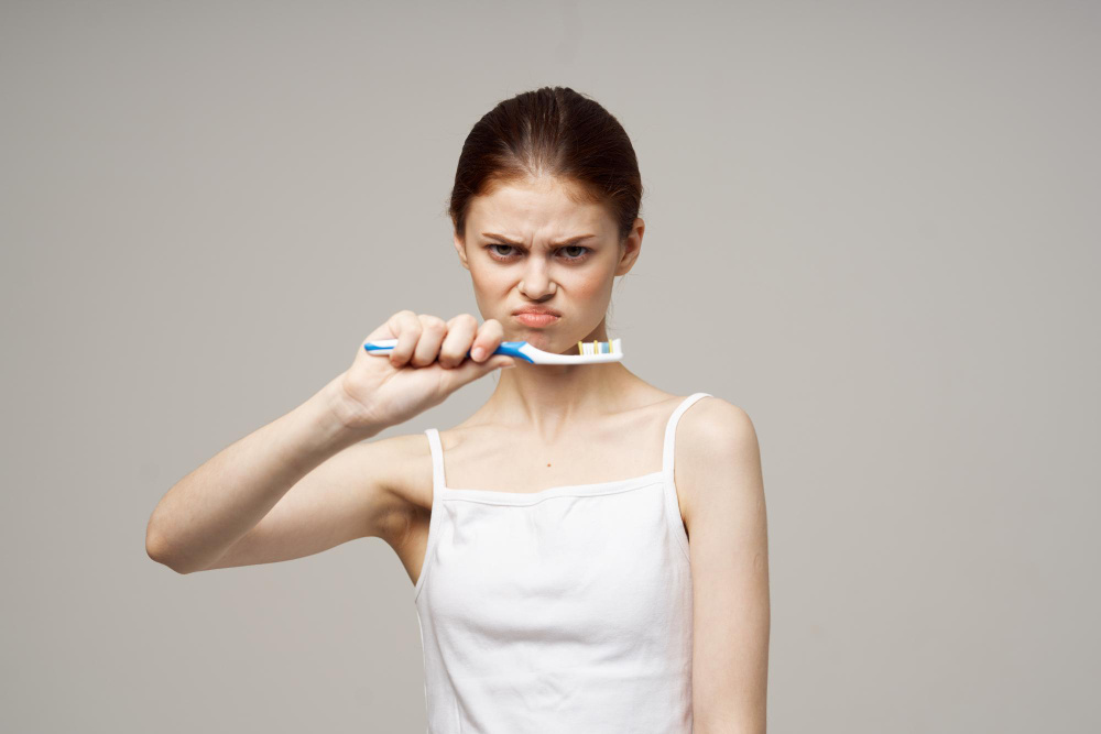 3. Сильно надавливают на зубную щетку. Чересчур сильные надавливания также ведут к повреждению десен и преждевременному стиранию эмали. Воспаленные десны постепенно истончаются и как будто сползают с зуба — со временем пациенты замечают, что у них начинают обнажаться шейки зубов. Стирание эмали может проявляться повышением чувствительности зубов и их пожелтением.