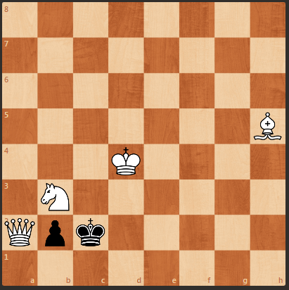 Очредная шахматная задача. Автор Э.Ньюхос, 1940 год. Черный король не может никуда сходить, а так же черные не могут двигать пешку. При ходе черных на доске пат. Но в данном случае ход белых, мат в 2 хода. Хитрый мат, задача времен СССР тут>>>