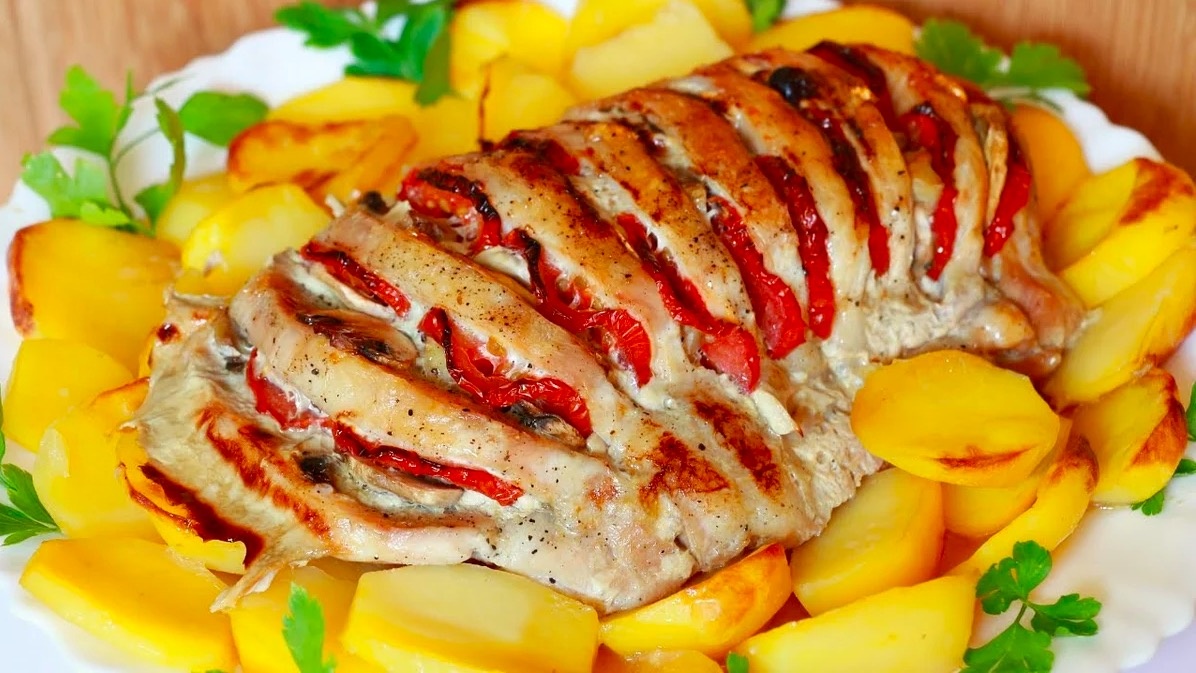 Попробуйте приготовить - вам наверняка понравится! :) Удачи! Ингредиенты: Свинина — 1 Килограмм Помидоры — 2 Штуки Сыр — 200 Грамм Чеснок — 3 Зубчика Соль, перец — - По вкусу