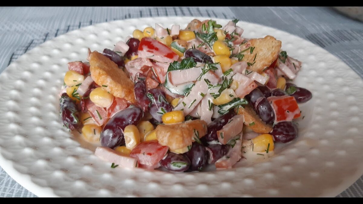 Простой рецепт сытного и вкусного салата с курицей, фасолью и сыром.