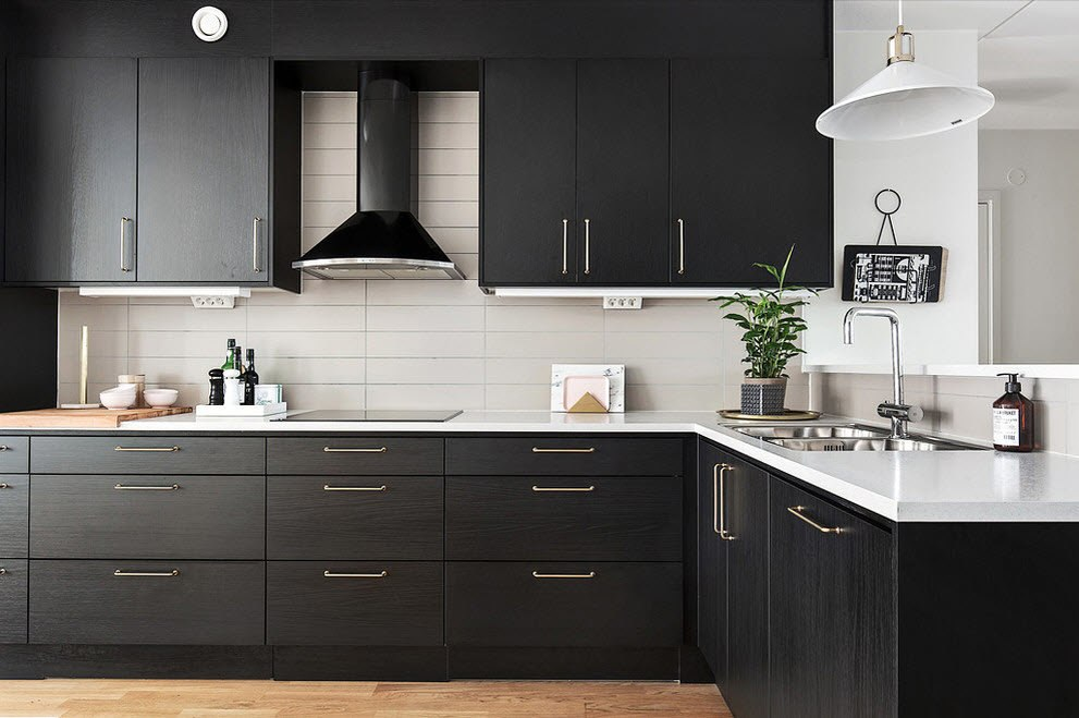 Темные или даже черные фасады создадут невероятно красивый контраст вместе со светлыми столешницами и не выглядят при этом громоздко. Вы можете подумать, что такое дизайнерское решение придаст угрюмости вашему дому, но это не так: темные фасады будут выглядеть ярко будучи акцентом и изюминкой, а не основным цветом. Светлые полы, стальная раковина, необычный холодильник, оригинальное освещение, яркий ковер - все это является идеальным дополнением к темному гарнитуру!