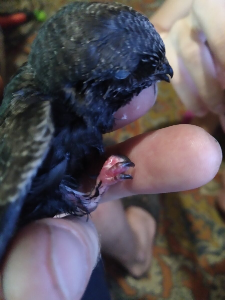 Уложив маленький комочек в коробку, мы начали искать информацию о нем в интернете. Оказалось, это стриж. На вид ему было дней 20. Только, в отличие от фото из интернета, у нашего птенца были постоянно закрыты глаза, взъерошены перья, он не поднимал голову и постоянно молчал… Есть он так же отказывался, только жадно пил воду с моего пальца, по капельке.