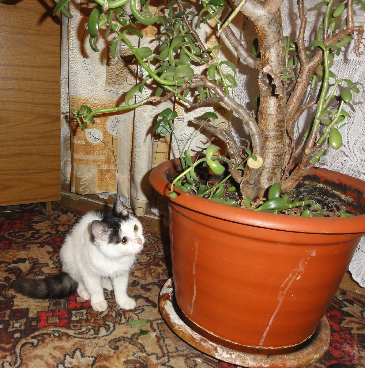 Со второй попытки забираю домой Йакова и лёгкие цветы. Главным цветоводом оказался Альхен, тут же перевернувший маленькую толстянку. Пришлось её прятать за горшком с нашей пальмочкой.