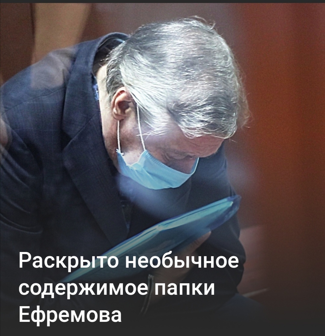 В папке Михаила Ефремова, с которой он прибыл на оглашение приговора, был текст пьесы. Необычное содержимое папки раскрыла сестра артиста Анастасия изданию Starhit. Отвечая на вопрос, осознавал ли Ефремов, что происходило во время суда, сестра артиста заявила, что он все понимал. «Думаю, чего это он с собой принес — может, текст речи какой… А то была пьеса! Ни вещи какие-то, ни что другое. Пьеса для него — вот, что самое важное», — поделилась она. Как считает Анастасия Ефремова, у тех, кто «со злорадством» требовал наказать артиста, ничего не получилось. «Вы наказали всех, лишив их его. Мишка — это подарок нам, людям», — заявила она, добавив, что страну «на какое-то время» лишили одного из лучших артистов. Она добавила, что актеру не страшно никакое наказание, если будет возможность деятельности. 15 сентября Ефремов выступил перед сокамерниками с отрывком из пьесы. Как рассказала уполномоченный по правам человека в Москве Татьяна Потяева, актер доволен условиями содержания и компани